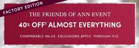 Ann Taylor Factory is pleased to offer high-quality styles designed specifically for our factory stores. The “Comparable Value” comparison is based on similar styles from full-price Ann Taylor stores or elsewhere in the marketplace. Our goal is always to offer you the quality styles you love at a fair value. Excludes clearance, taxes, activation of gift cards and payment of an Ann Taylor, Ann Taylor Mastercard, LOFT or LOFT Mastercard credit card account. Not combinable with any other offer or total store promotion unless otherwise specified. Except as stated in the return policy, no adjustment to prior purchases. Not valid for cash. Valid only in Ann Taylor Factory Stores now through 11/3/2025.