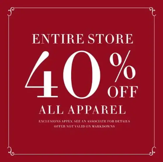 Entire Store 40% Off All Apparel | Exclusions Apply. See An Associate for details